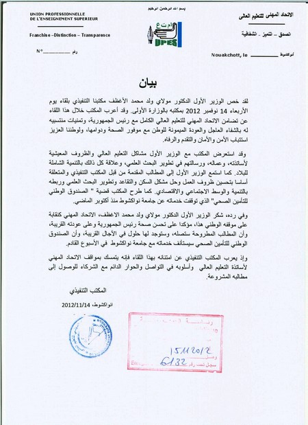 Dans un communiqué dont copie est parvenue à Cridem, l’Union Professionnelle de l’Enseignement Supérieur (UPES) a indiqué que son bureau exécutif a été reçu en audience mercredi dernier par le Premier ministre Dr Moulaye Ould Mohamed Laghdaf.