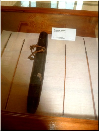 Des carquois, des flèches, un bonnet de guerrier, une pointe de lance, un poignard avec son fourreau, une têtière de cheval d’un cavalier d’Ahmadou et quelques manuscrits d’El Hadj Omar.
