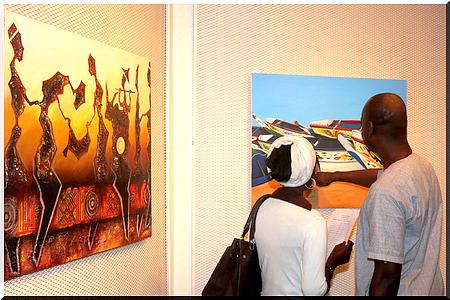 CultuRim - Avec leur tablette, Smartphone ou encore appareil photo, des visiteurs immortalisent les œuvres de Mokhis et de Hamady qui investissent l’Institut Français de Mauritanie (IFM), jusqu’au 26 avril. Cette exposition commune intitulée "Dialogue de générations" propose deux démarches artistiques, deux regards sur la vie, deux esthétiques de la peinture mauritanienne.