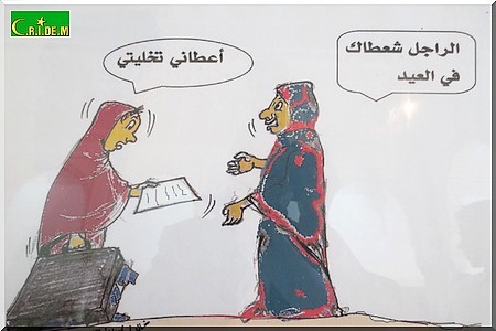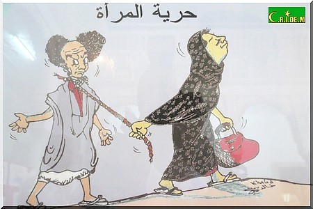 "Je suis émerveillée et fière que ce soit un mauritanien qui ait tant de talent. Là, j’en ai une preuve nouvelle. Je suis également émerveillée par l’originalité du travail de Khaled Moulay Idriss", confie Marième Daddah contemplant une de ces caricatures où l’on voit une femme tirer son mari par un nœud.