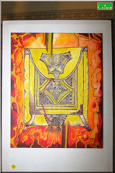 A travers une vingtaine d’œuvres, Khadijétou Mint Ismaïl soumet le visiteur à un véritable retour aux sources. Et, au-delà , elle exprime son refus de voir disparaître tout le cadre naturel de la vie nomade. D’où l’art au service du patrimoine culturel.
