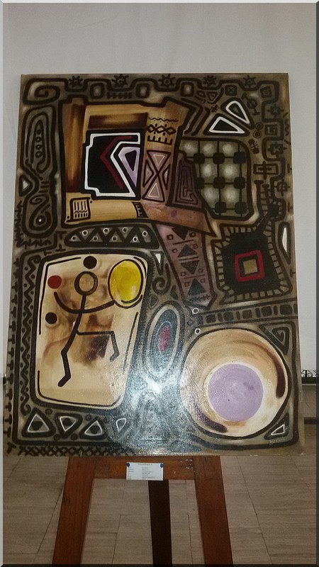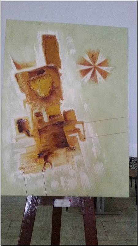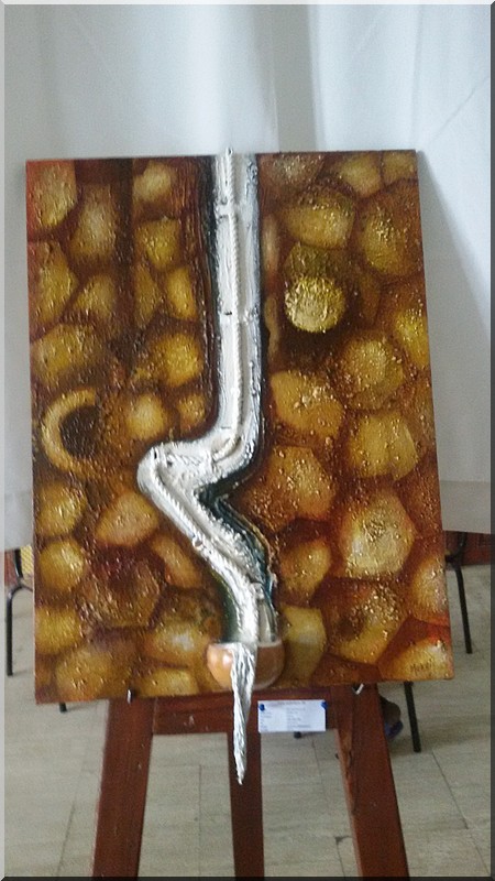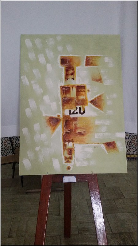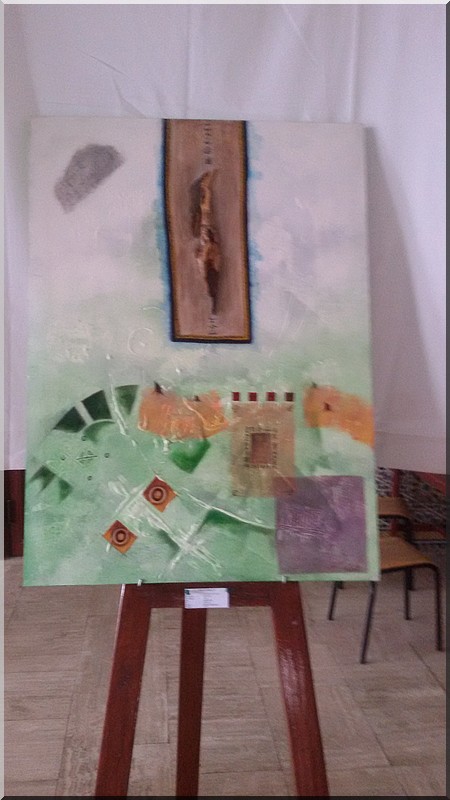 Mokhis expose une dizaine de tableaux titrés : « le saxophoniste », « le Carré magique », « le Jongleur », « le Gardien de la Cité », « équilibre dans l’espace », « le Marathonien », « sur les traces du Mahatma », « le livre sacré », « c’est tout ce qui reste ? »(Le Coran) et « l’eau source de vie ».
