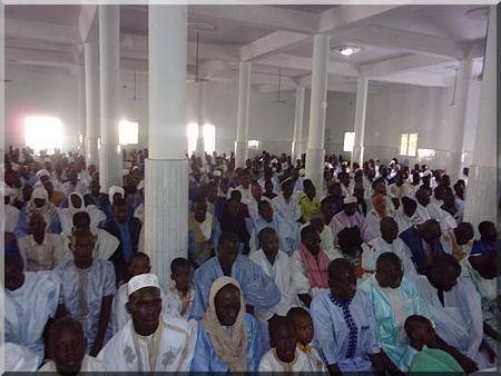 Chérif Tayib, arrière, arrière, petit fils du fondateur de la confrérie tidiane, Cheikh Ahmed Tidiane Chérif, en visite chez nous, a prié l’aïd el fitr à la deuxième mosquée de Nouakchott (de par l’âge), sise aux ilots L, avec le vieux Thierno Daouda Bâ.