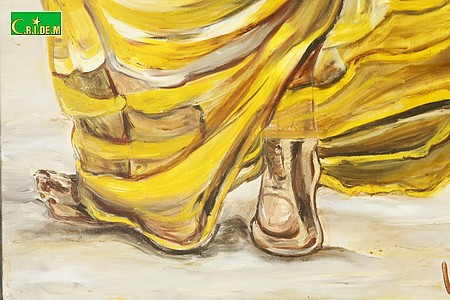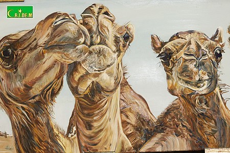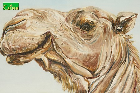 Enfin portrait de chameaux dont les têtes perchées dans l’azur nous narguent de leur hauteur. Leur regard et leur expression finement sculptés par des jeux d’ombre et de lumière s’animent sous la précision des touches du pinceau. Ils sont reconstitués en un troupeau imaginaire dans un puzzle géant.