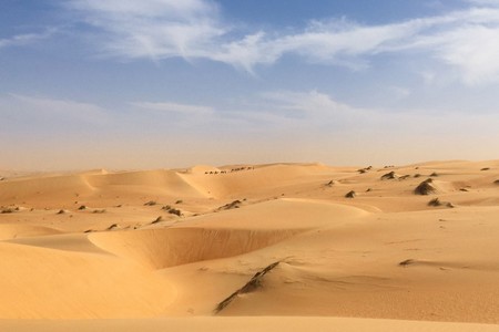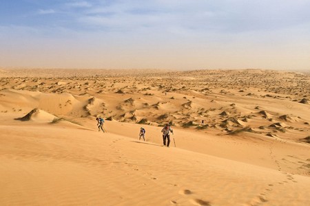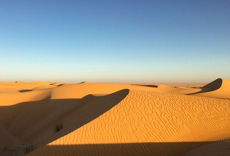 Après un déjeuner à l’occidental préparé par notre cuisinier Ahmed, nous entamons notre deuxième partie de la journée avec 2 heures de marche. Cette partie de 8 kms traverse des grandes et hautes dunes de sables. On s’enfonce dans le sable, il fait chaud, c’est dure physiquement mais qu’est-ce que c’est bon. Nous ne savons plus où donner de la tête. A droite ? A gauche ? A chaque fois un paysage somptueux fait de vagues jaunes, de fines herbes vertes et d’un ciel… si bleu.