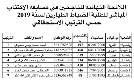 Essahraa - L'Etat-major général des armées/ 3e Bureau a rendu public les résultats du concours de recrutement d’élèves officiers pilotes pour l’année 2019, qui se présentent selon l’ordre du mérite comme suit :
