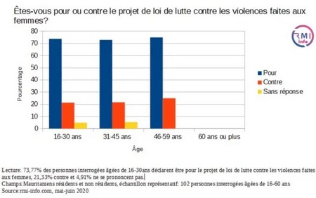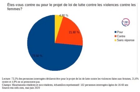 L’enquête présentée ci-dessous montre bel et bien l’adhésion des mauritaniennes et des mauritaniens à ce projet de loi. En effet, 73,5% des personnes interrogées âgées de 16 à 60 ans déclarent être pour l’adoption de ce projet, 21,6% contre et 4,9% ne se prononcent pas. Les mauritaniens votent le projet de loi de lutte contre les violences faites aux femmes.