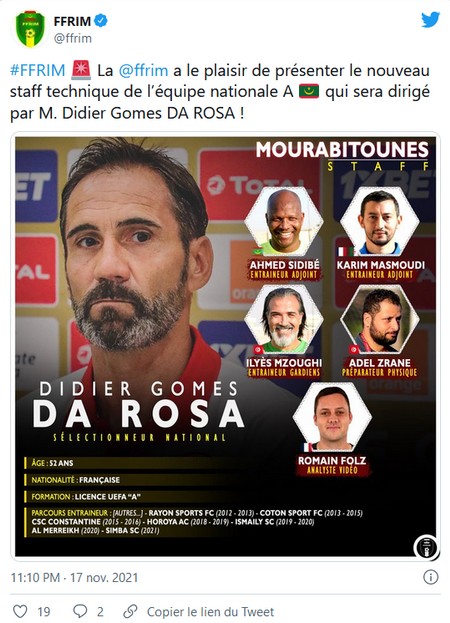 18-11-2021 15:11 - Mauritanie : le staff technique du nouvel entraîneur des Mourabitounes Didier Gomes Da Rosa connu