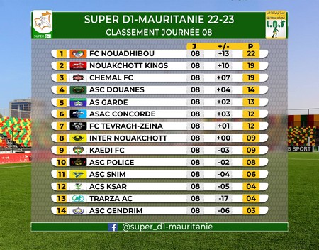 Avec cette victoire, les champions en titre maintiennent leur place de leader avec 22 points, devant Nouakchott King’s (19 points) qui est venu à bout de Gendrim, la lanterne rouge (3 points).
