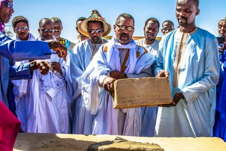 Vers 10 heures, suivant l’agenda du programme, la première pierre de la salle d’Expos, fut posée par le Hakem Adjoint, le maire de la commune d’Aleg et le président du Musée de la Vache.