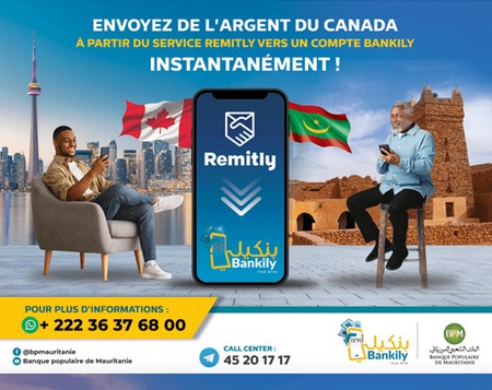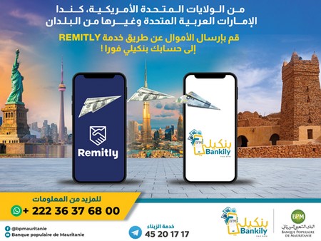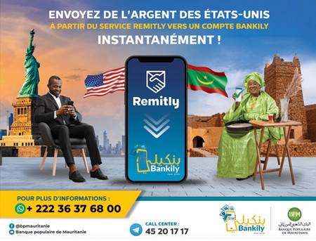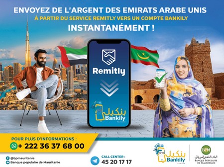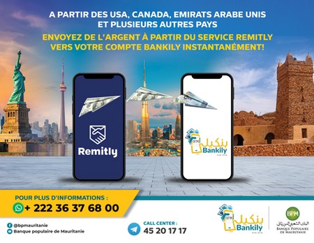 BPM - En plus de son récent partenariat avec le service ORANGE MONEY EUROPE, La Banque Populaire de Mauritanie informe de la possibilité de recevoir des fonds à partir des Etats-Unis, du Canada, des Emirats Arabes Unis, de l’Angleterre et de tous les pays européens via son partenaire REMITLY.